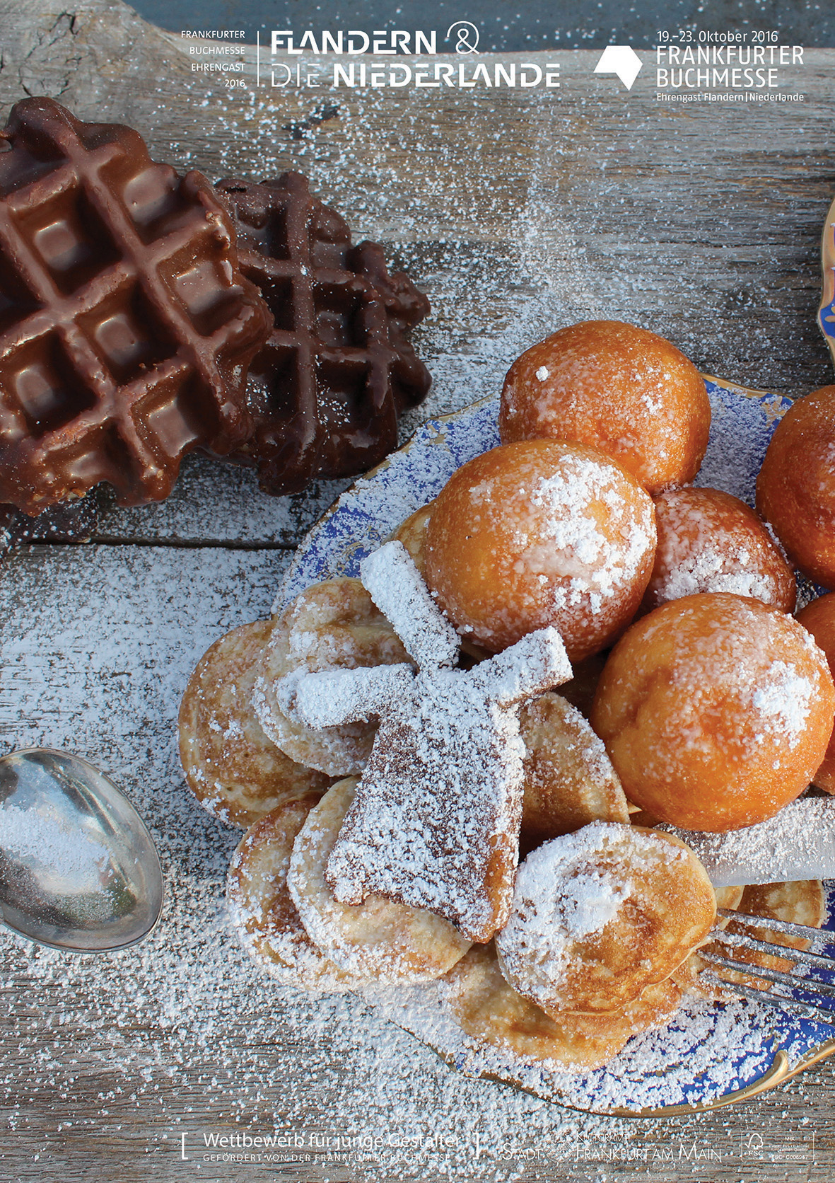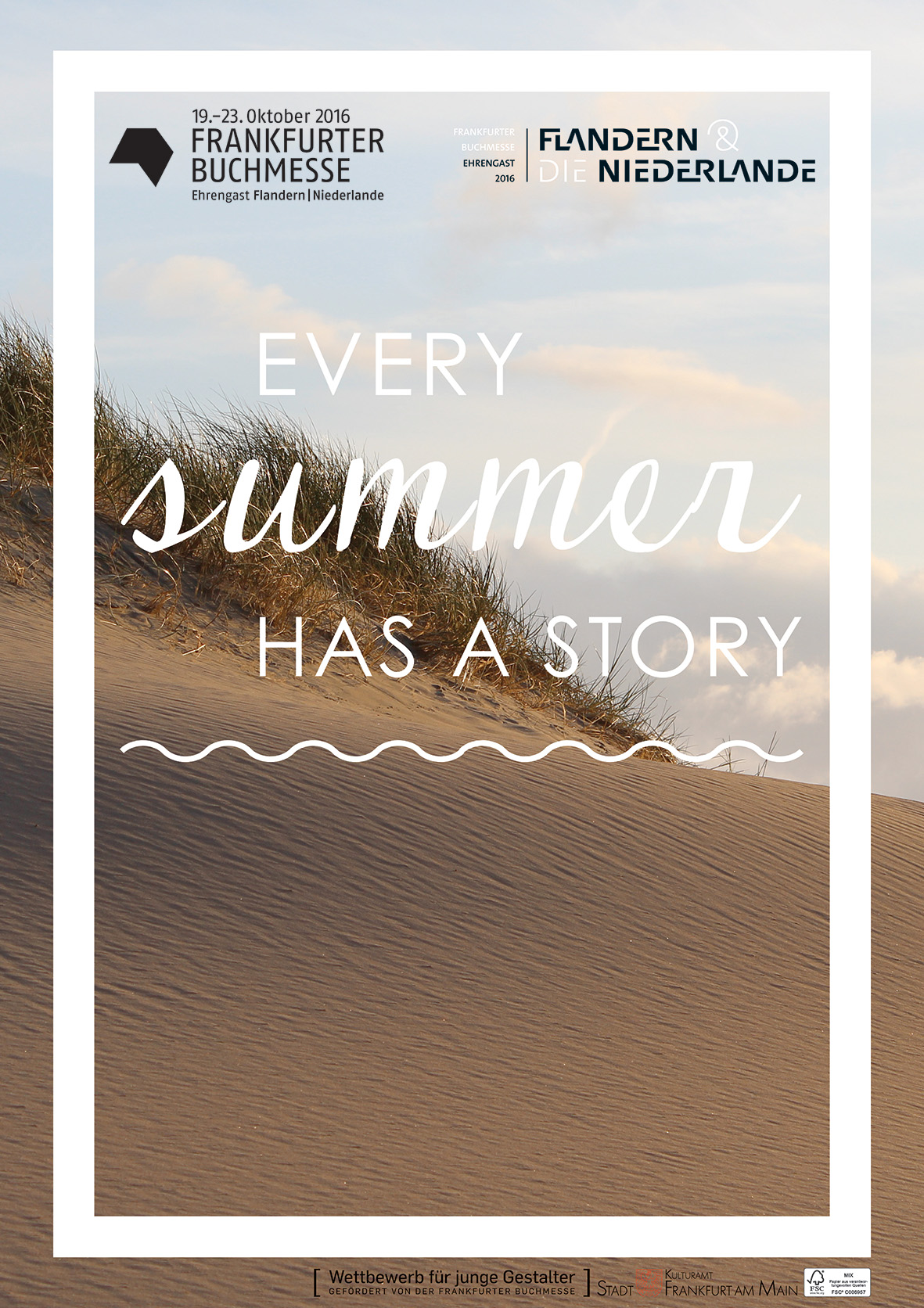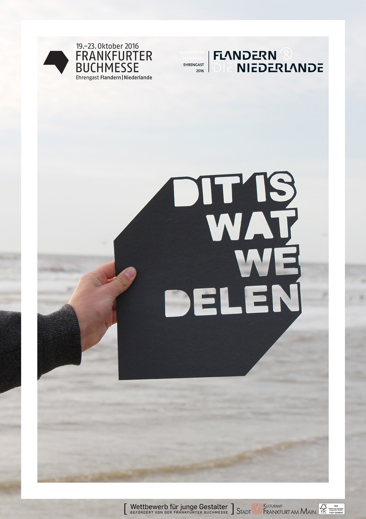 Ein origineller Willkommensgruß für den Ehrengast der Frankfurter Buchmesse 2016 sollte als Plakat visualisiert werden. Der Ehrengast war bei dieser 68. Frankfuter Buchmesse Flandern und die Niederlande. Sie teilen nicht nur eine gemensame Sprache, das Niederländische, sie können auch auf eine gemeinsame Geschichte der Kunst, Kultur und Literatur zurück blicken. Sie teilen die gemeiname Dynamik. Und gemeinsam mit ihrem Gastgeber Deutschland, der Heimat der Buchmesse, teilen sie auch die Nordsee.