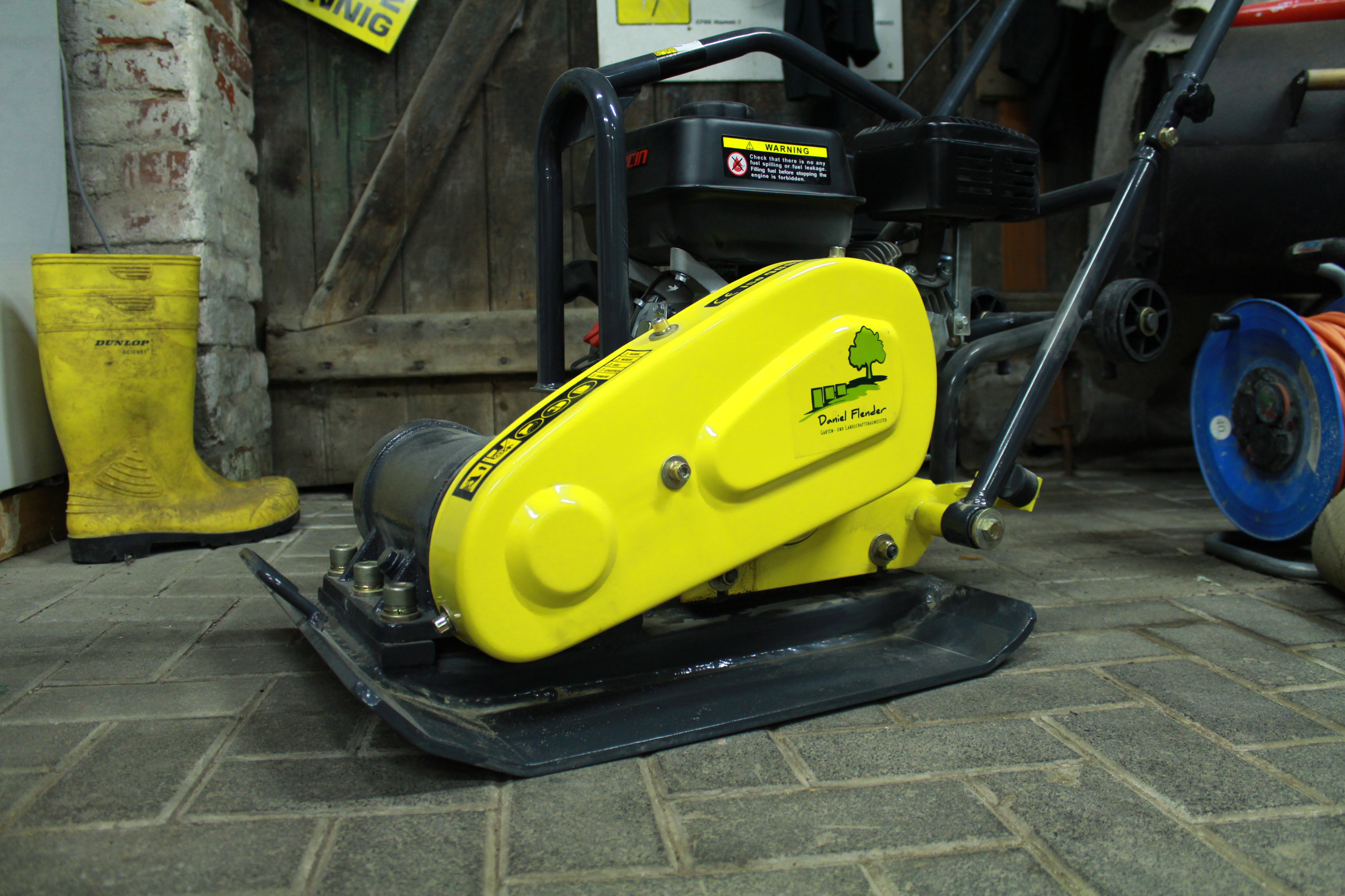 Kleine und große Aufkleber mit dem farbigen Firmenlogo kennzeichnen jegliche Maschinen und Arbeitswerkzeuge. Auf den grün-schwarzen Arbeitsklamotten wird das weiße Firmenlogo verwendet.
