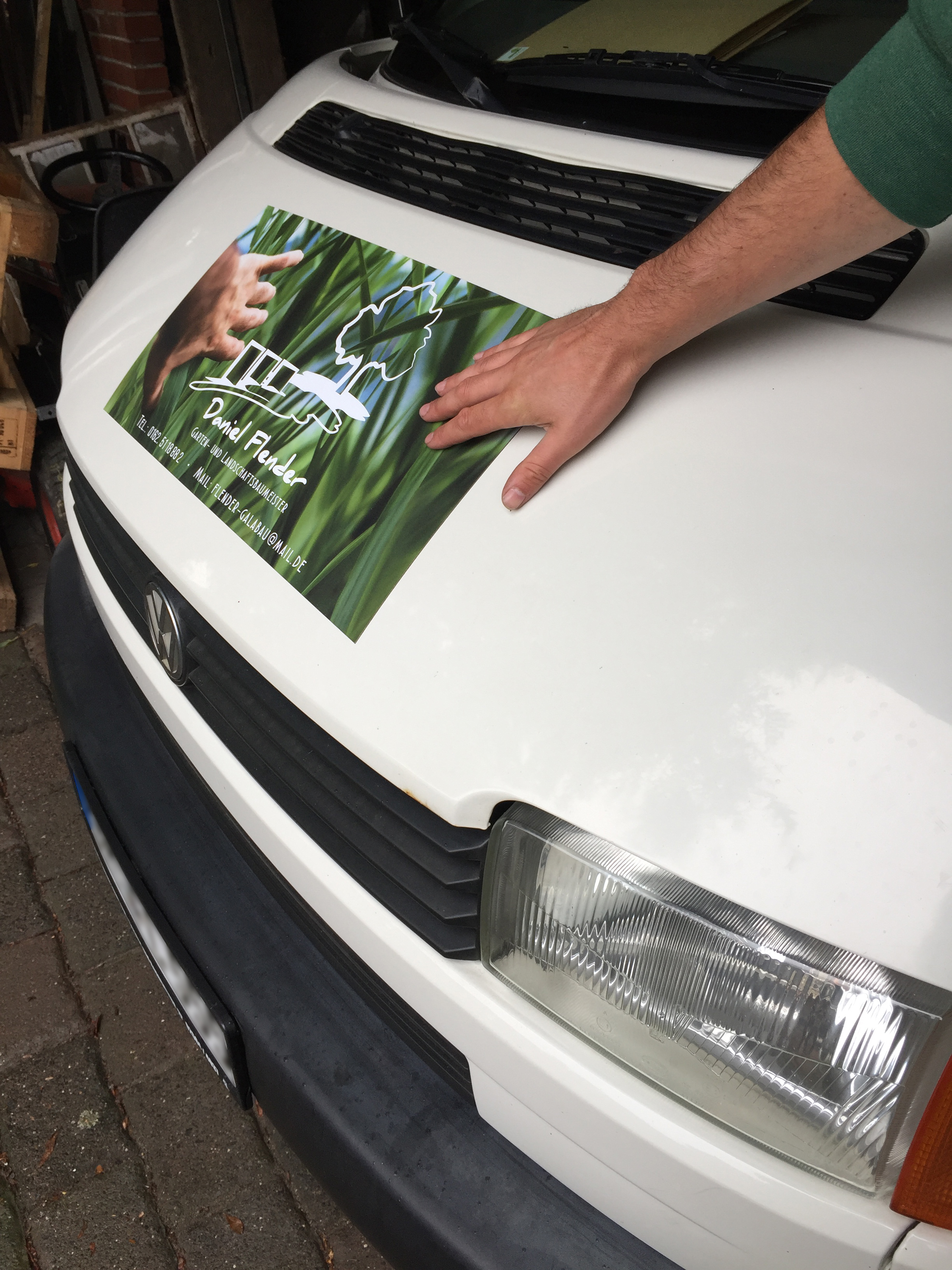Die Hand vor einer Grasfläche bildet das Key Visual des Unternehmens und findet sich auf der Visitenkarte und den Magnettafeln für die Fahrzeuge wieder.
