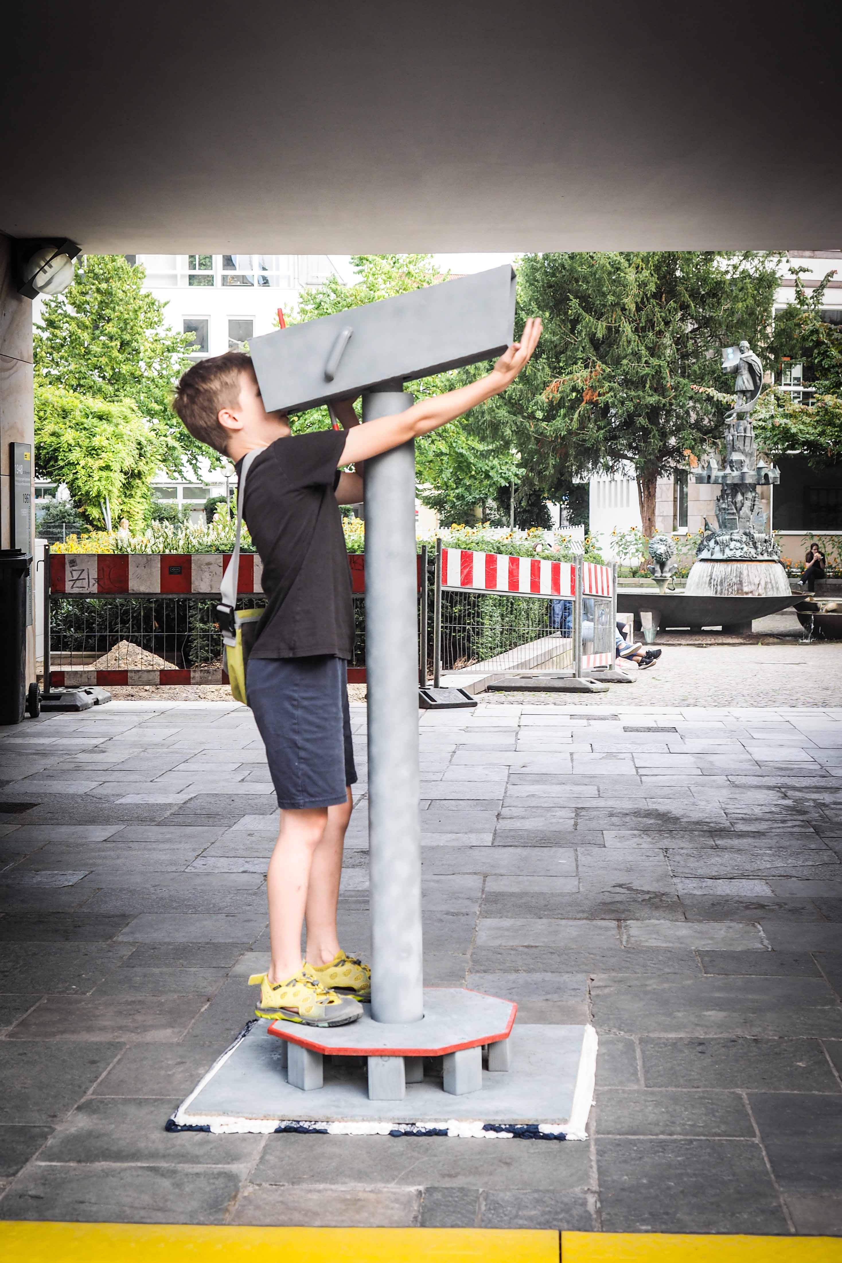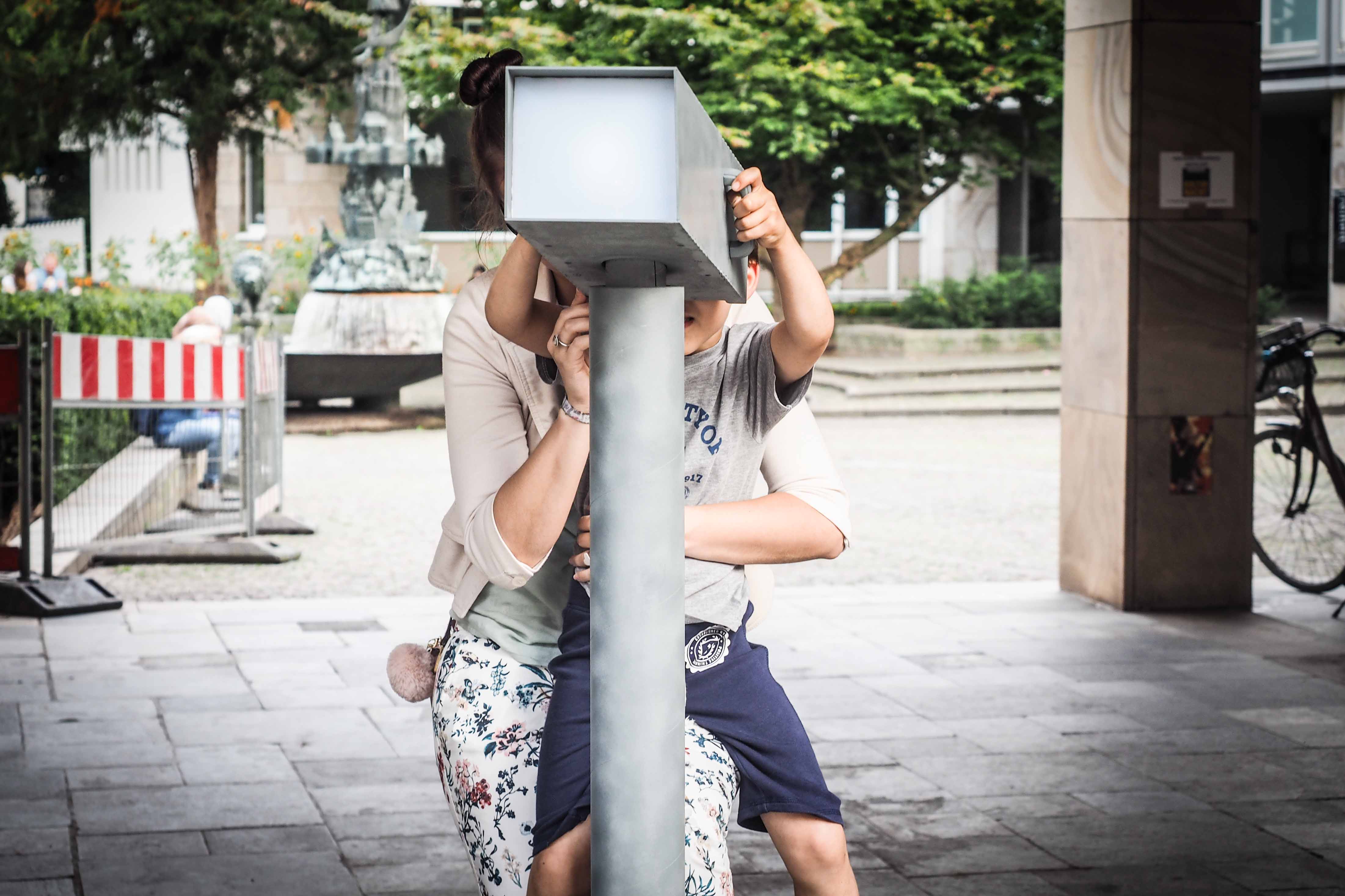 Als Bauvorlage des Exponates wurde ein "echtes" Münzfernrohr verwendet. Durch dieses Fernrohr mit integrierter VR-Brille ist es möglich schnell einen Blick in die VR-Welt des Osnabrücker Marktplatzes zu werfen, ohne dass man die VR-Brille mühevoll aufsetzen und sie fixieren muss.