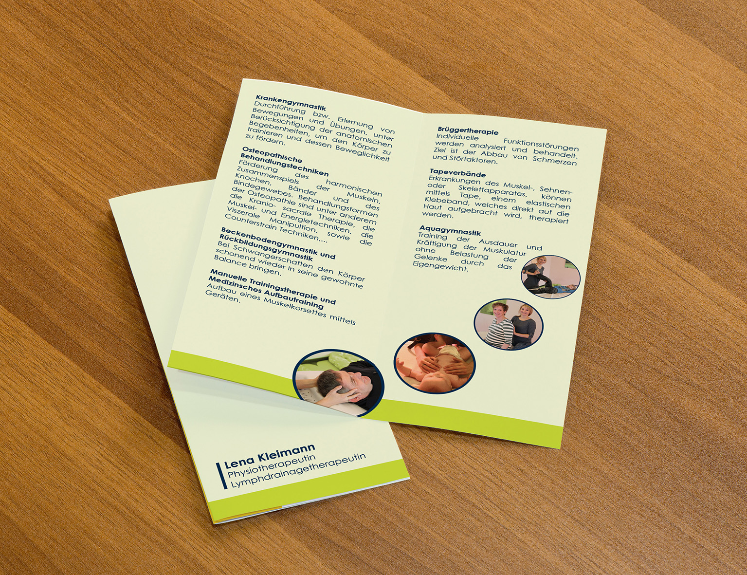 Die Therapiepraxis Kleimann hatte lange Zeit kein eignes Logo. Während eines Briefings stellte sich heraus, dass die Kundin konkrete Vorstellungen von ihrem Logo hatte. So sollte eine Hand mit einer Spirale im Hintergrund stehen, welche eine Abwandlung von da Vincis vitruvianischem Menschen stützt. Diese Elemente galt es somit zu erstellen. Statt einer proportionalen Ansicht des Menschen entschied ich mich für den Körperaufbau. Die Farben wurden in Grün und Blautönen gehalten. Später benötigte Frau Kleimann einen Flyer für ihre Praxis. Hierfür und auch bei den verwendeten Bilder, die während des Shootings entstanden, wurden die im Logo verwendeten Farben verwendet.