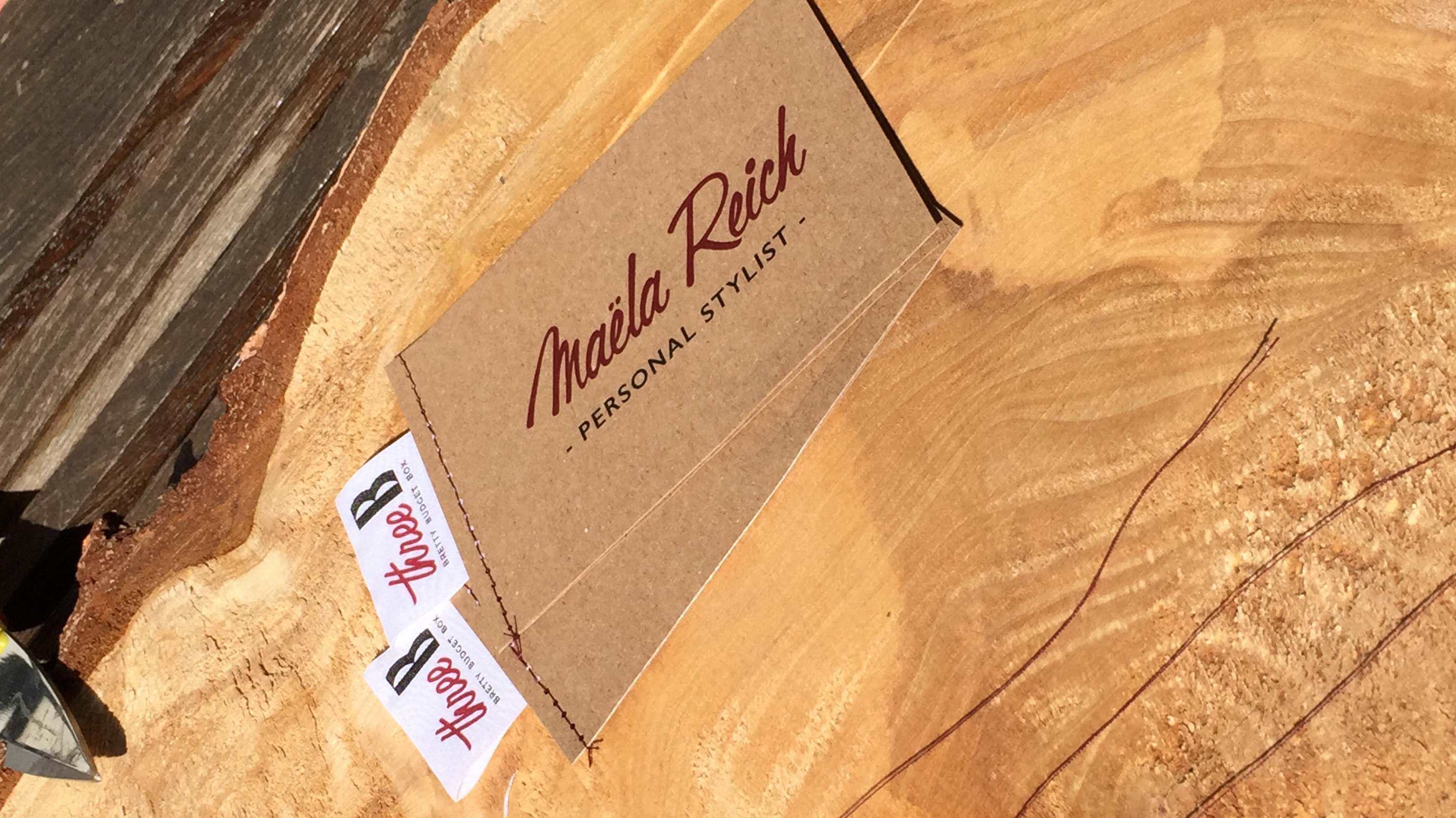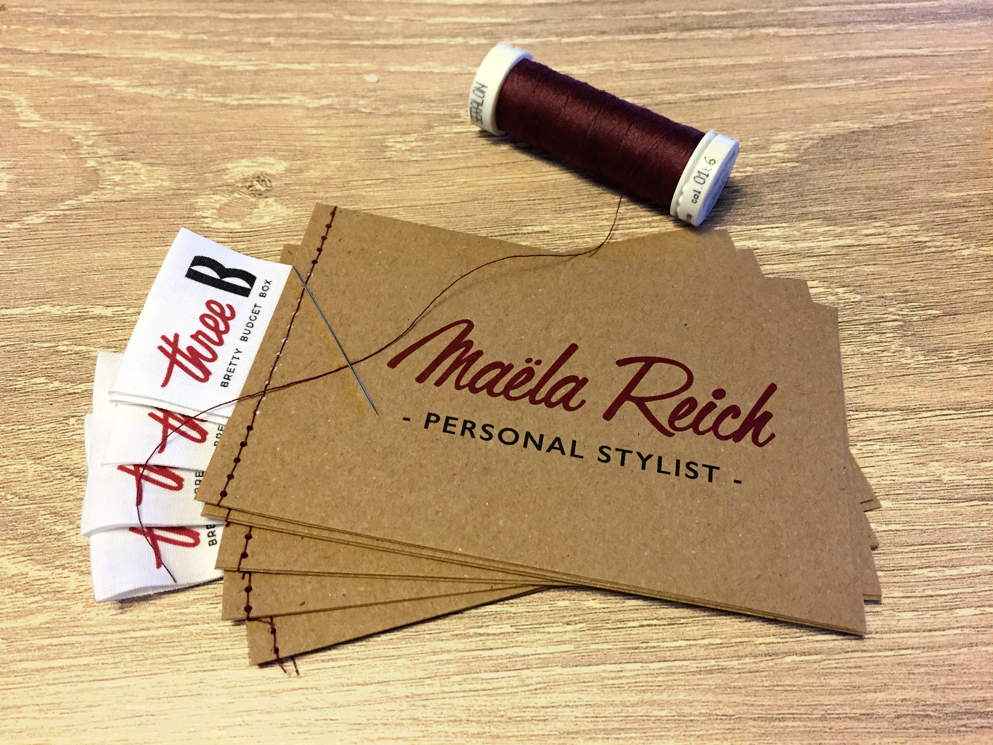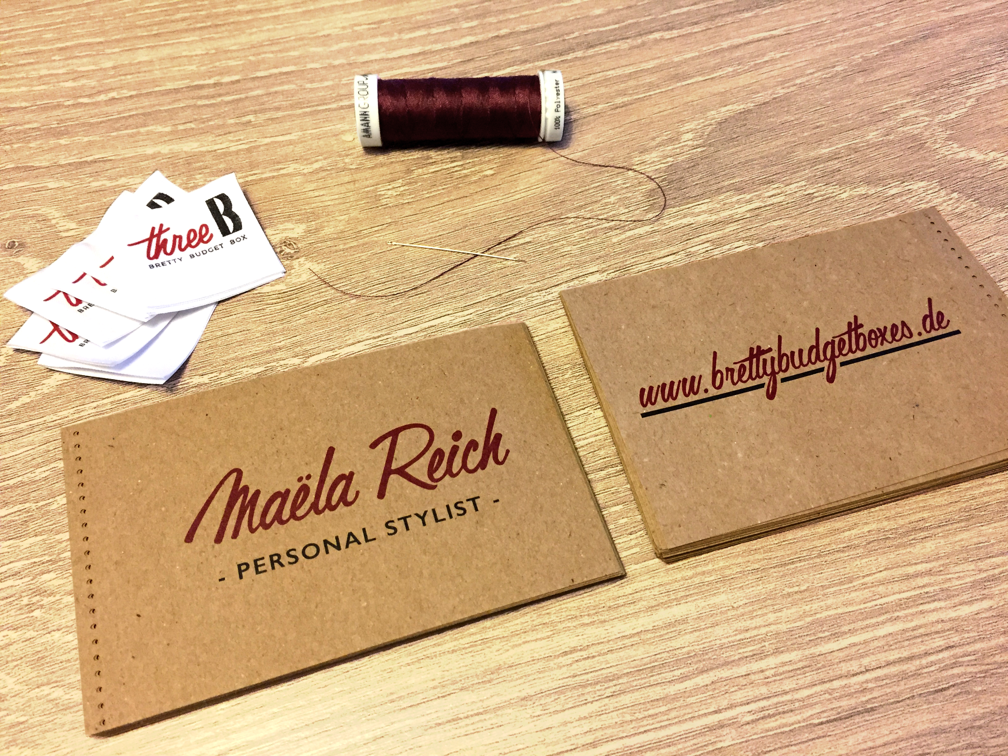 Bretty Budget Box - oder kurz Three B - ist ein modernes Modeunternehmen. Hier kann man sich zu einem bestimmten Budget ein Outfit erstellen lassen, welches garantiert nicht von der Stange kommt. Vor allem werden diese Outfits individuell mit Designermarken aus Italien und England sowie Vintagemode zusammengestellt. Tree B legt hierbei besondern wert auf die Verarbeitung und das Herkunftsland der Ware. Da das Unternehmen sowohl Frauen-, wie auch Männermode zusammenstellt, sollte dieser Aspekt ebenfalls im Logo widergespiegelt werden. "Three" ist der weibliche Part des Logos, welches sich leicht an das männliche "B" schmiegt. Bei der Visitenkarte war es mir wichtig, das diese wie auch die Outfits von Three B, etwas besonderes sind. Die Liebe für's Detail soll sich hier ebenso widerspiegeln. Aufgrund dessen wurde jede Visitenkarte mit einem Modeetikett versehen und per Hand eingenäht. Hierfür wurde ein Naturpapier verwendet um ebenso den Aspekt des Vintages und der Nachhaltigkeit aufzugreifen.