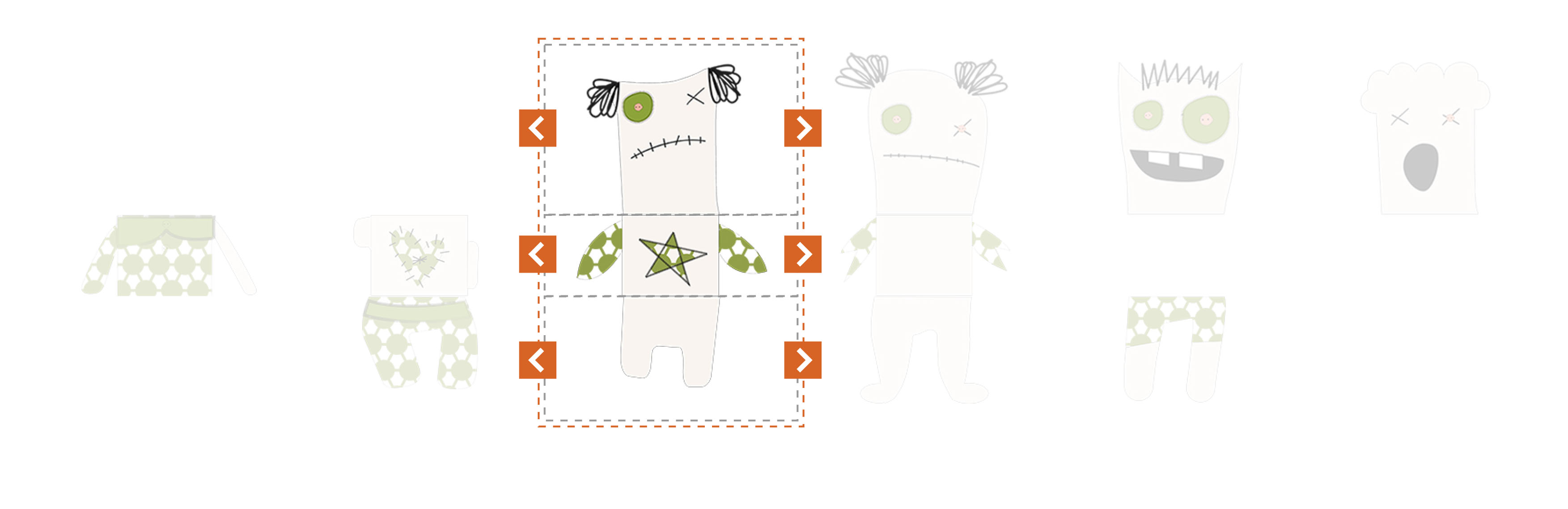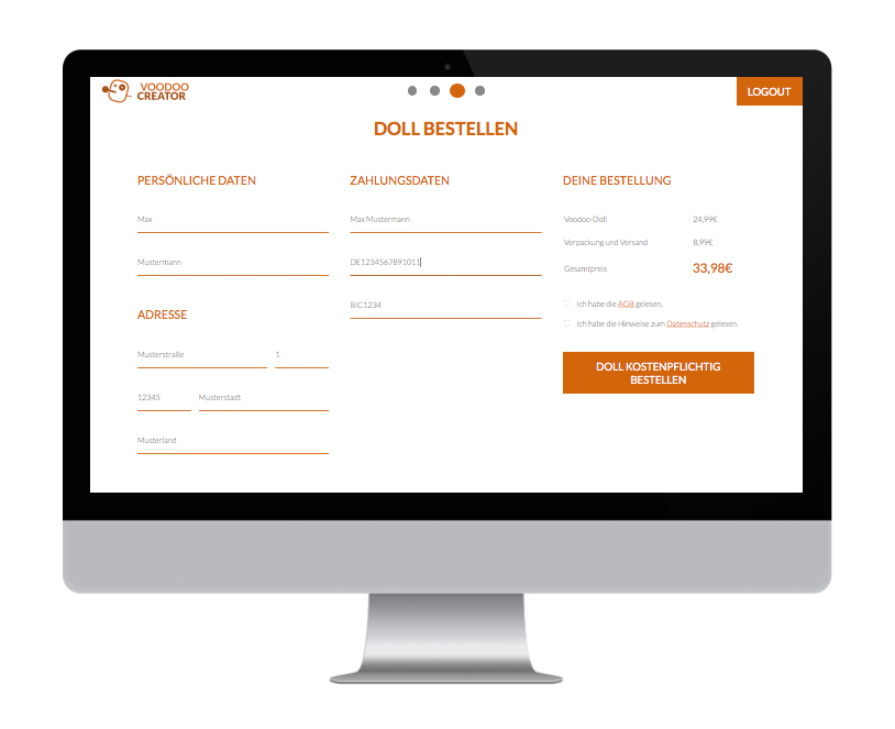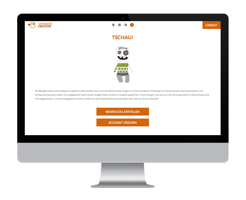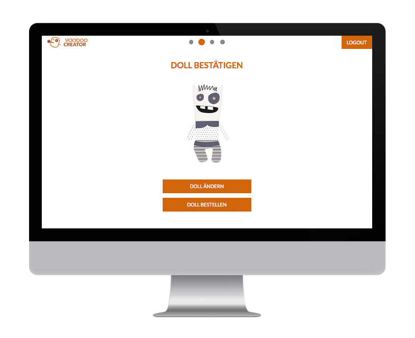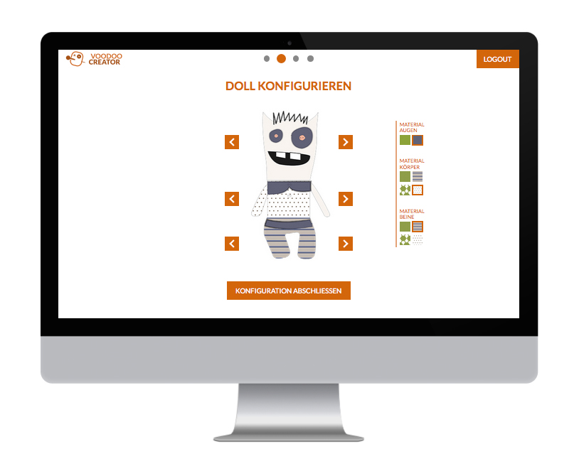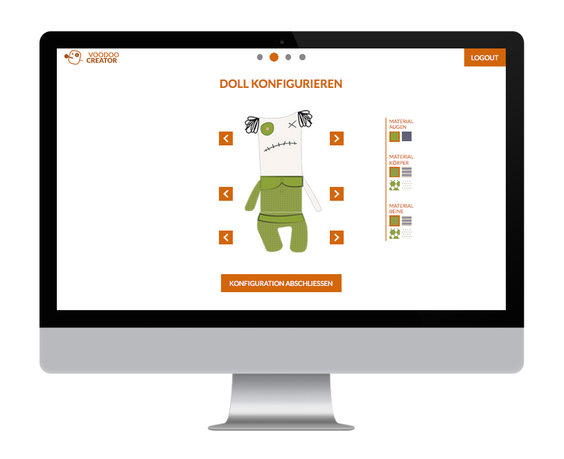 Als Student muss man während des Semesters so manche Tortur über sich ergehen lassen. Aufgaben sind unlösbar und so mancher Dozent raubt einem den letzten Nerv. Manchmal steigt die Wut und der Ärger gar ins unermässliche und man wünscht sich, seiner Wut mal so richtig “freien Lauf” zu lassen. Mit dieser Erfahrung im Hinterkopf war die Idee für einen interaktiven Prototypen getreu dem Semesterthema “Kombinieren und Konfigurieren” schnell gefunden - ein System zum konfigurieren einer eigenen individuellen Doll sollte entstehen und in mehreren methodischen Schritten vorbereitet und anschließend möglichst funktionstüchtig umgesetzt werden. So schnell wie auch die Idee für das Thema der Voodoo-Dolls kam, so schnell stand auch fest wie diese aussehen sollten. Die ersten Skizzen entstanden somit bereits bei der Definition der Zielgruppe. Da diese jedoch wie ein Kinder-Klapp-Bilderbuch in auswechselbare Körperteile unterteilt werden sollten, mussten hierfür vorab eine Grundfigur mit Illustrator erstellt werden, um die Maße einhalten zu können. Es wurden somit vier verschiedene Köpfe, Ober- und Unterkörper erstellt. Somit gibt können aus insgesamt 12 Körperteilen 64 verschiedene Kombinationsmöglichkeiten und somit 64 unterschiedliche Voodoo-Dolls erstellt werden. Da jede dieser 64 Möglichkeiten noch in vier verschiedenen Mustern bzw. Stoffen auswählbar sind, gibt es letzten Endes 4096 Möglichkeiten sich seinen persönliches Voodoo-Doll zu erstellen. Es wurden für den Konfigurationsprozess somit 64 Körperteile grafisch mit Illustrator erstellt. Zusätzlich wurde angedacht die Voodoo-Doll in zwei verschiedenen Größen anzubieten. Diese Überlegung wurde bis jetzt allerdings nur beim Erstellen zweier Prototyp-Dolls umgesetzt, im System noch nicht.